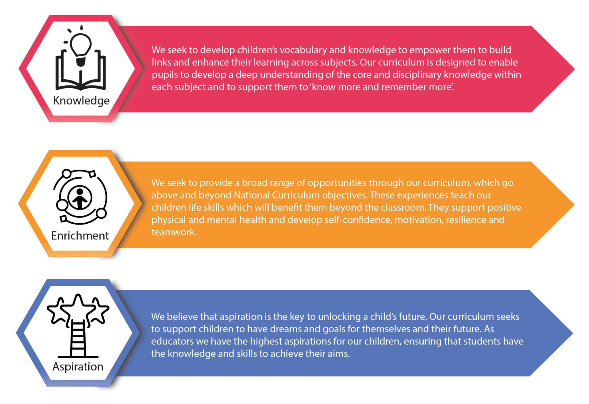 Our approach to curriculum development and delivery is informed by current pedagogy. Our curriculum leaders engage with educational research and best practice in order to support strong outcomes for children. Core and foundation subjects are taught discretely in our school so that children develop a strong understanding of each subject’s specific knowledge and skills.
